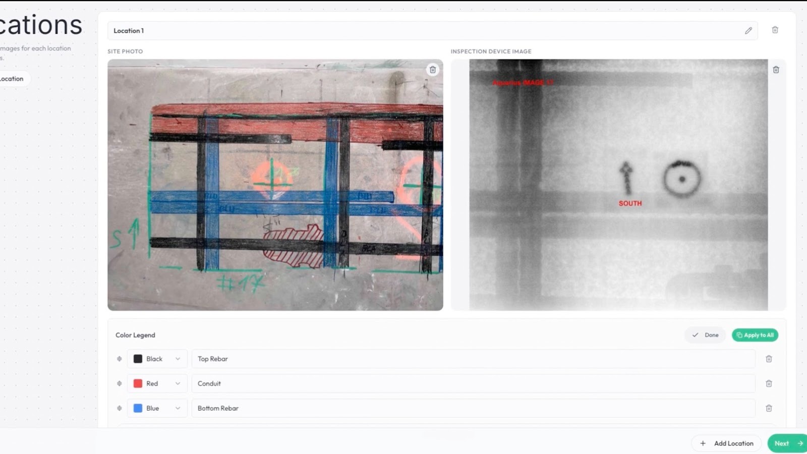 This is also where the imaging advantage becomes obvious. The crew is not trying to estimate what is inside the slab based on indirect signal behavior. They can look at the slab image and see the embedded elements directly to determine whether that hole will fit.